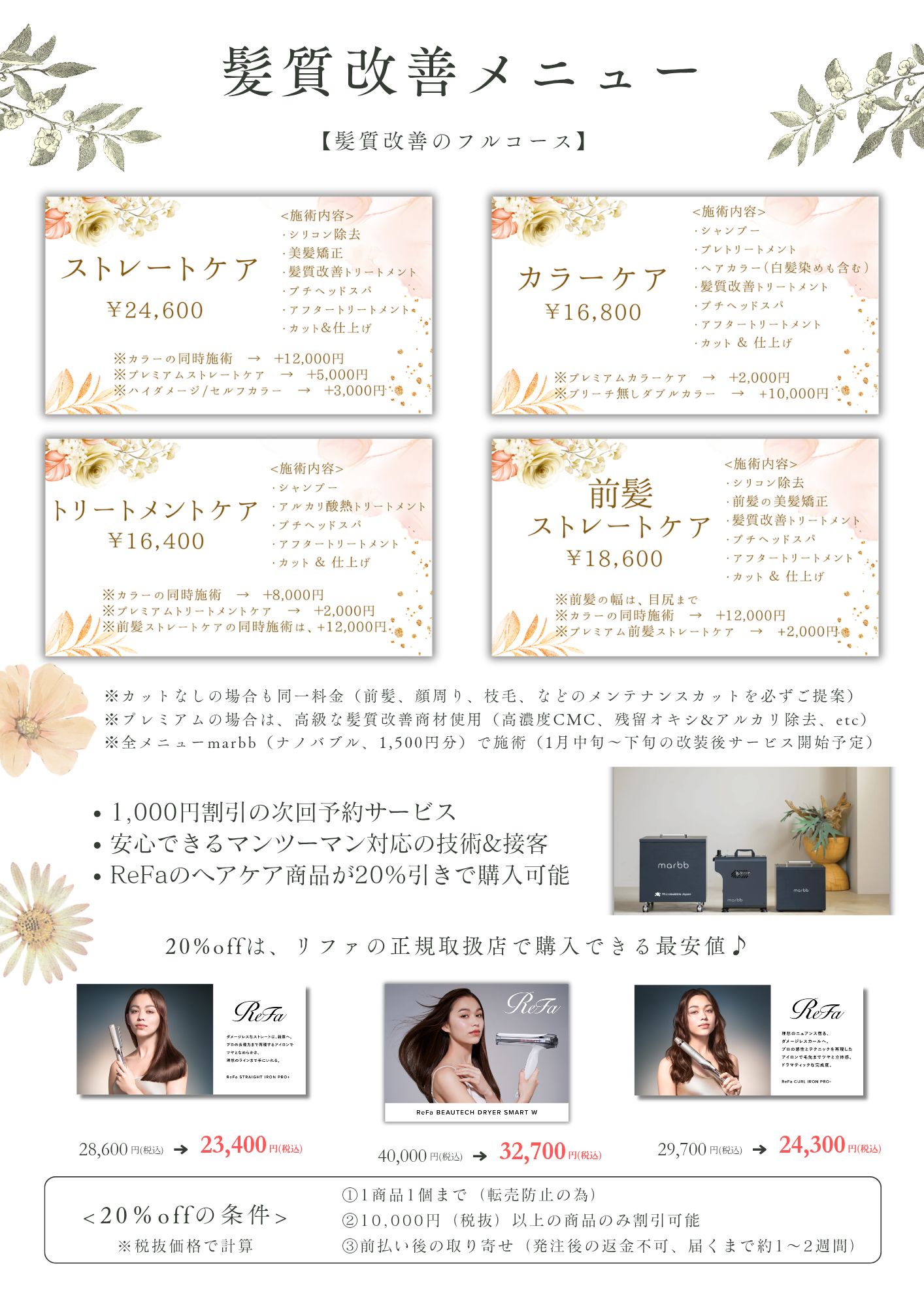 (前髪、顔周り、枝毛などのメンテナンスカットを必ずご提案) - 全メニューmarbb(ナノバブル、約1500円分)で施術(1月中旬~下旬の改装後にサービス開始)
